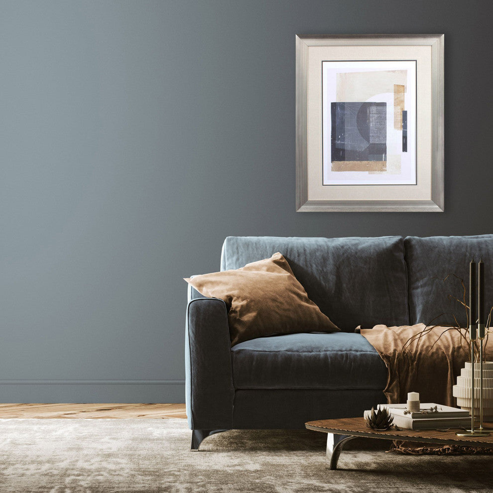 This modern abstract print with geometric shapes is double matted with a premium mat and framed in a brushed silver finish moulding.