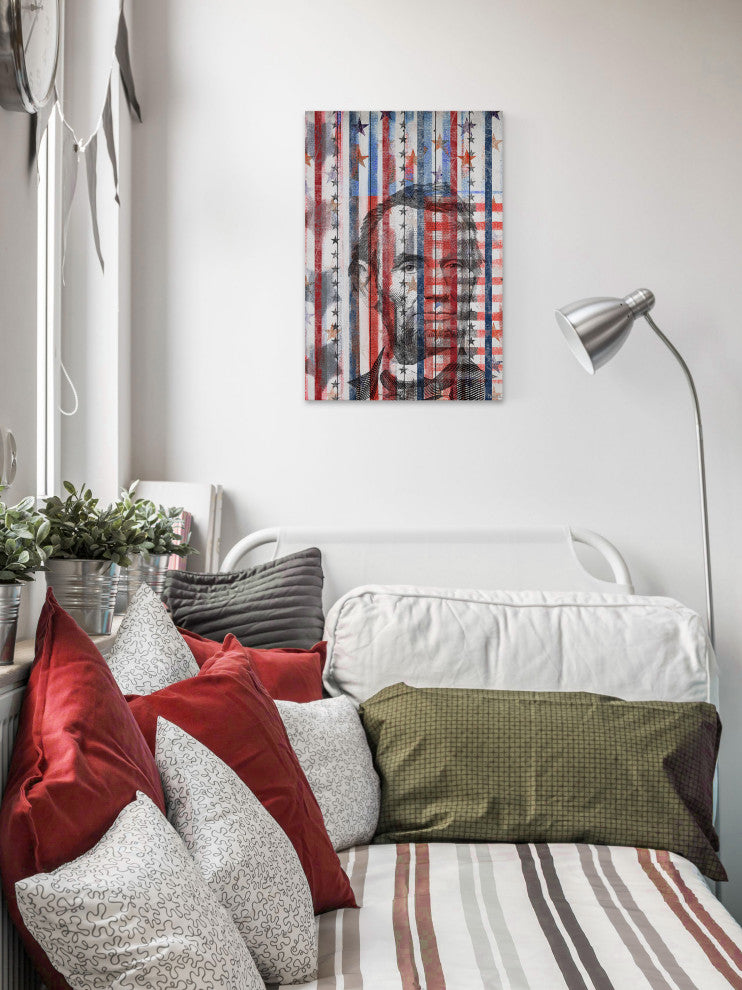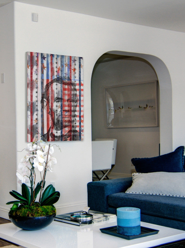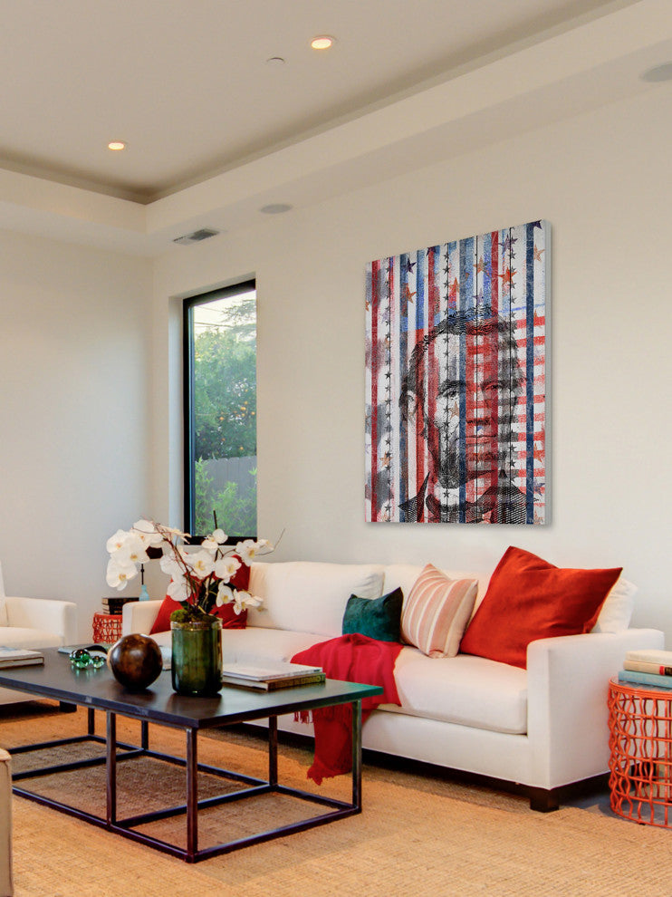 Striking and unique, the "Honest Abe" Print on White Wood by Parvez Taj will bring your walls to life. Printed on white wood, this 40 inch wide by 60 inch tall contemporary artwork will make a statement in any living room, dining room, or bedroom.- Fine art UV ink print on white wood by Parvez Taj- wood pieces are hand-selected by Fine craftsmen for printing- Arrives ready to hang- Includes a certificate of authenticity- Artist signature on the front