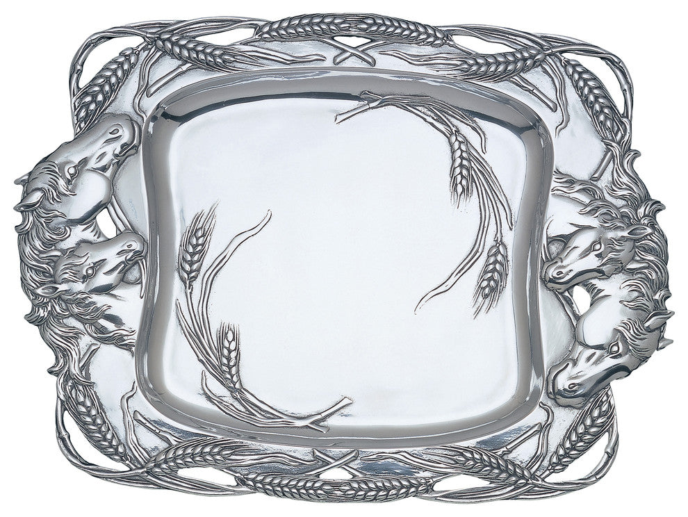 This handsome Horse Clutch Tray by Arthur Court Designs is the perfect housewarming gift for the host who has everything. This unusual serving piece is sure to be a standout hit at any dinner party and can be used to chill food in the refrigerator or freezer prior to serving. Individually crafted and hand polished, this tarnish-free, cast aluminum tray is also FDA approved food safe. Arthur Court Designs is conservation and wildlife conscious and contributes a portion of proceeds to support environmental research and education. This unique Horse Clutch Tray will be a memorable addition to your typical serving ware.