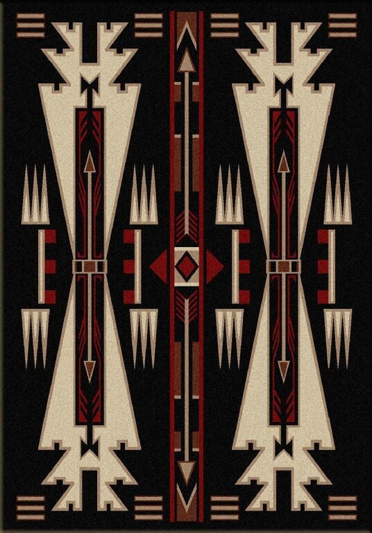 The two central figures in this rug may have just returned from a horse raid. The inlaid arrows tell part of the story. This striking rug turns an ordinary room into ?The? room. Made in America!