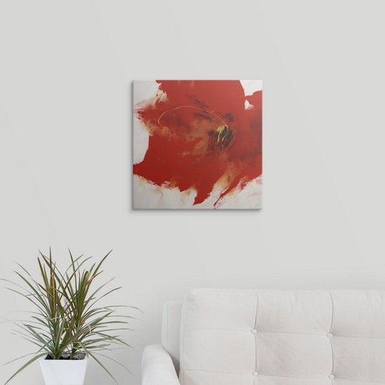 Gallery-wrapped canvas entitled, "Hot Spot I".Abstract painting of a large red flower with edges that are spattered and roughly brushed on a solid white background.Our wrapped canvases feature a proprietary design that prevents warping or sagging over time. By using archival inks and artist-grade canvas, our premium canvases are sure to add that extra touch to any space. Lastly, our canvases are finished with a closed back that incorporates pre-installed hanging hardware for easy installation.