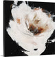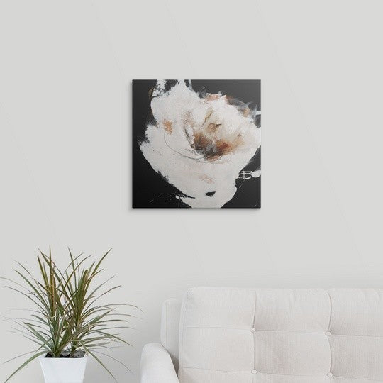Gallery-wrapped canvas entitled, "Hot Spot II".Abstract painting of a large white flower with a dark center, painted with thick brushstrokes and spattered edges on a solid black background.Our wrapped canvases feature a proprietary design that prevents warping or sagging over time. By using archival inks and artist-grade canvas, our premium canvases are sure to add that extra touch to any space. Lastly, our canvases are finished with a closed back that incorporates pre-installed hanging hardware for easy installation.