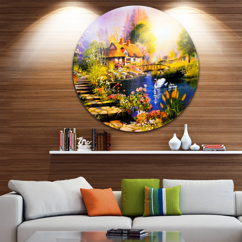 House Near The Lake Swans, Landscape Round Metal Wall Art, 38"