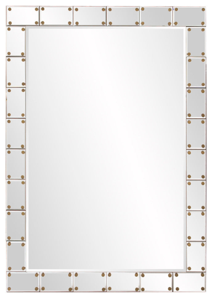 The Remington Mirror is a Contemporary piece featuring a frame composed of clear mirrored tiles that surround the central mirror. Each tile is adorned with flat bronze studs. It is a perfect focal point for an entryway, bathroom, bedroom or any room in your home. D-rings are affixed to the back of the mirror so it is ready to hang right out of the box! Each mirrored tile on this piece has a bevel adding to its beauty and style. The Remington Mirror can be hung vertically or horizontally.