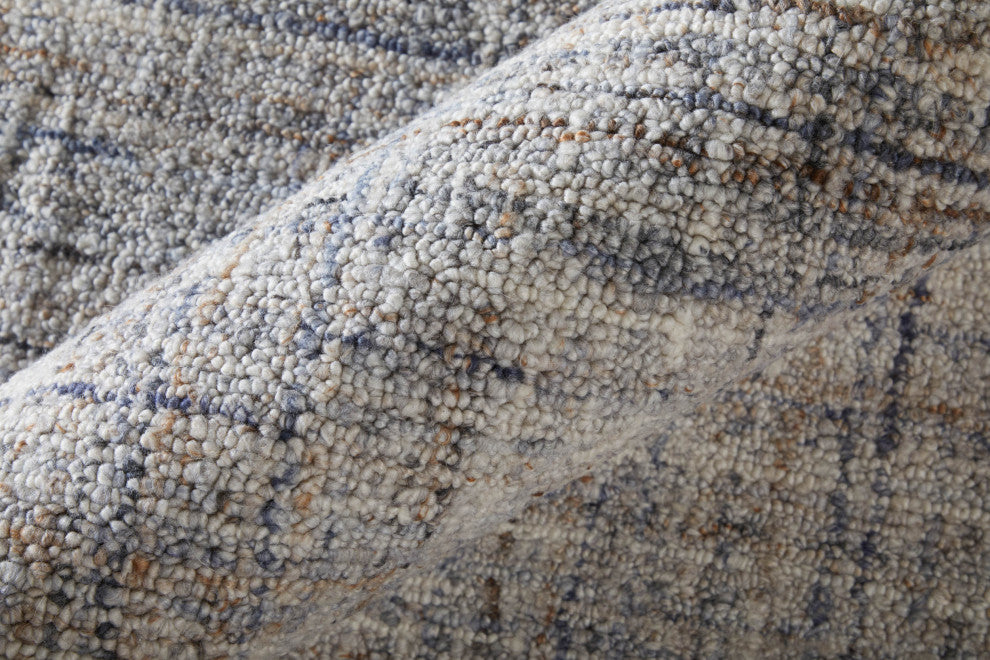 • This rug features a subtle plaid design with interwoven lines in muted shades of gray, beige, and blue, creating a textured and contemporary appearance.