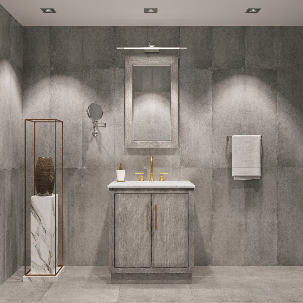 Hugo Carrara White Marble Countertop Vanity in Gray Oak, Satin Gold Hardware, 30", Vanity With Gooseneck Faucet