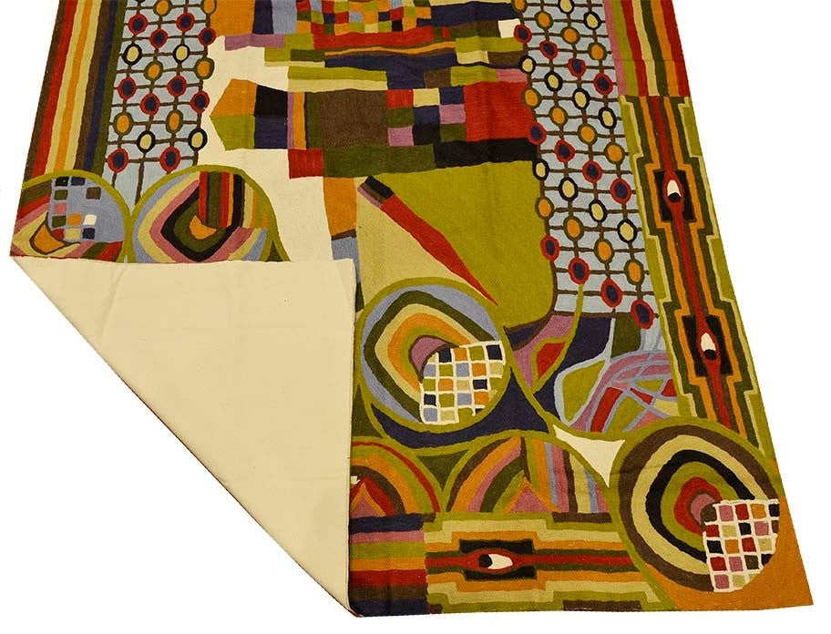 This modern accent wool Rug is hand embroidered by the finest artisans of Kashmir and design inspired by the works of modern artist, Friedensreich Hundertwasser. Many of our customers buy these contemporary rugs as a wall art to decorate the walls of their modern homes or to spice up their traditional decor. The expert Kashmiri needlework in this handmade, hand embroidered contemporary rug is of the finest chainstitch, a superlative stitch. The eye-catching design deserves to be seen and experienced. Wherever you place it, it is sure to draw attention. The Kashmir wool makes it soft to the touch, and the texture of the embroidery is a sensory delight. This area rug will make an excellent outdoor or indoor rug and will add fun and festive atmosphere to your home. A close-up view of this abstract modern rug allows you to see the amazing chain-stitch embroidery work of master artisans who have practiced this art their entire lives.This abstract rug could grace the cabin of your boat or the wall in your office. Perfect wherever you need a splash of color, this modern area rug creation is as durable as it is beautiful.The creases visible in the pictures are due to fold and will straigten instantly once mild iron is used from the back.Size: 6 ft x 4 ft (Approx.)Hand-embroidery: 100% Hand dyed Soft WoolBack & Base: 100 % Cotton CanvassWashing Instructions: Cold Hand Wash, Dry Flat & Mild warm Iron or simply Dry Clean.Cottage Industry ProductThe effect of Hundertwasser"™s painting is colour. Hundertwasser used colours instinctively, without associating them with a definite symbolism and preferred intensive, radiant colours. His style was to place complementary colors adjacent to emphasize the double movement of the spiral.