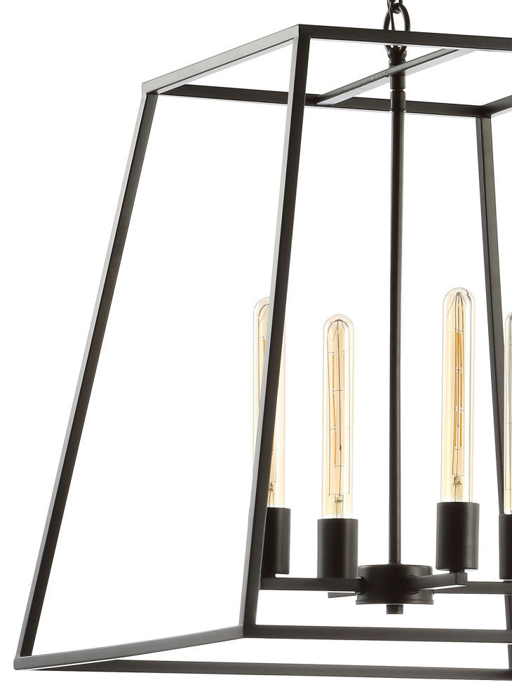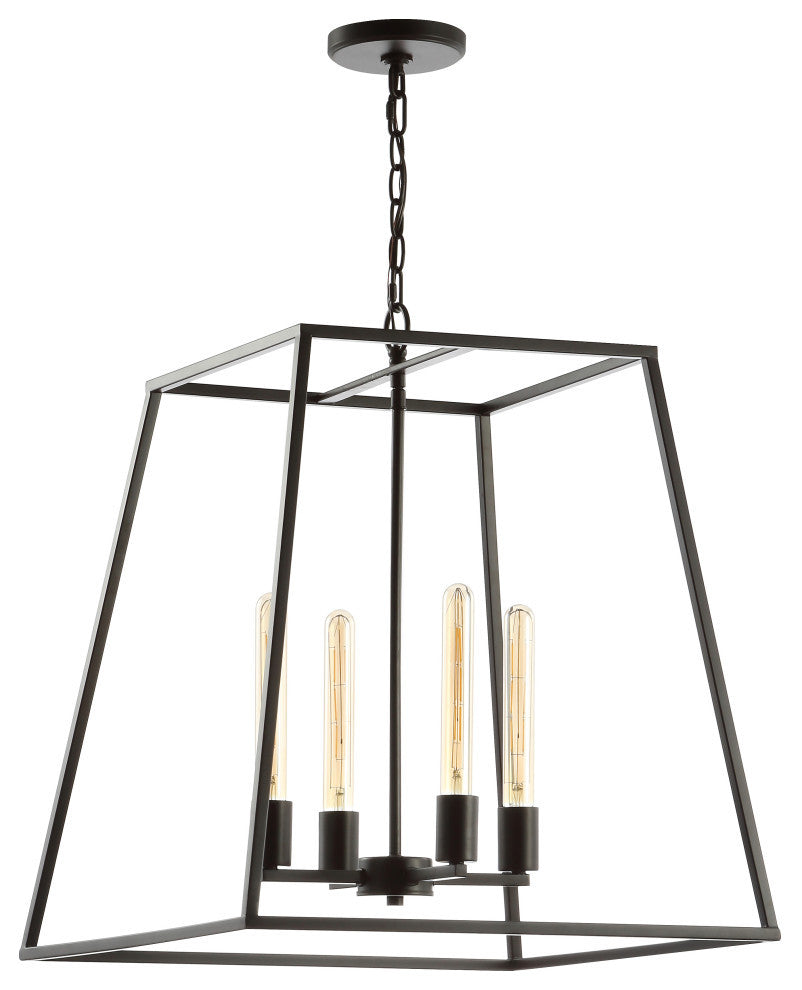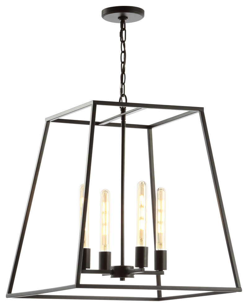 Clean lines and an angled silhouette give this minimalist ceiling lantern its distinctive look. The four candles are lit with Edison-style LED bulbs for a vintage touch. The 24" size is perfect for an entry or living room; try a pair over a long dining table for a mix of rustic and modern.Features:• Give your interiors a clean, uncluttered design makeover with this lantern''s mid- modern, minimalist design• Our light fixtures work with LED-compatible dimmers; professional installation is recommended• As this fixture must be hardwired, we recommend a professional electrician manage installation• Takes 4 bulbs and compatible with any 9WLED or 60W TYPE "A" or 13W CFL• Eco-friendly 9W bulbs included• Color: Oil Rubbed Bronze• Body Material: Metal• Includes: 1 lamps• Assembly RequiredDimensions:• Lamp: 29-101 inches high x 21 inches wide x 21 inches deepAbout us:You see a lamp.We see a decorative work of art.A perfectly curved shade casts a dramatic shadow on a floor. Compatible with LED lightbulbs: as easy on the environment as they are on the eyes. The JONATHAN Y Lighting collection considers every detail from impeccably sourced materials to designer styling. And our prices are so attractive, weve transformed a functional necessity into a fashion accessory.JONATHAN Y Lighting - a fashion revolution in home decor.