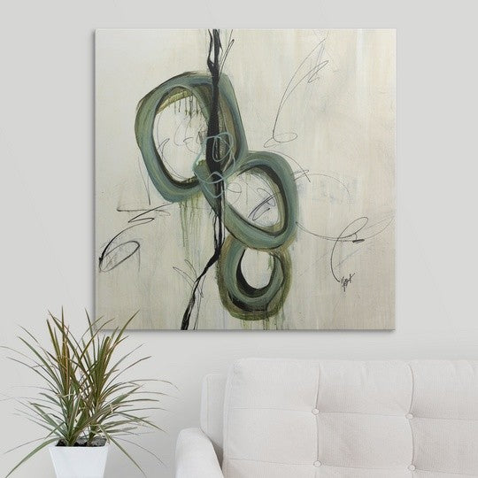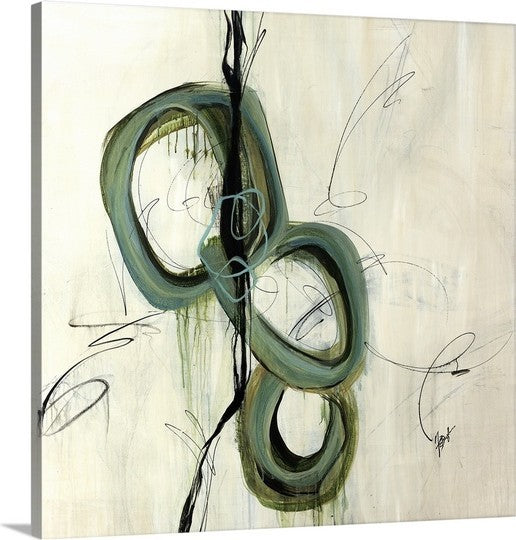 Gallery-wrapped canvas entitled, "Hyperbole II".Abstract art of three large intersecting circles that are vertically stacked, surrounded by thin swirling scribbles, on a light neutral background.Our wrapped canvases feature a proprietary design that prevents warping or sagging over time. By using archival inks and artist-grade canvas, our premium canvases are sure to add that extra touch to any space. Lastly, our canvases are finished with a closed back that incorporates pre-installed hanging hardware for easy installation.