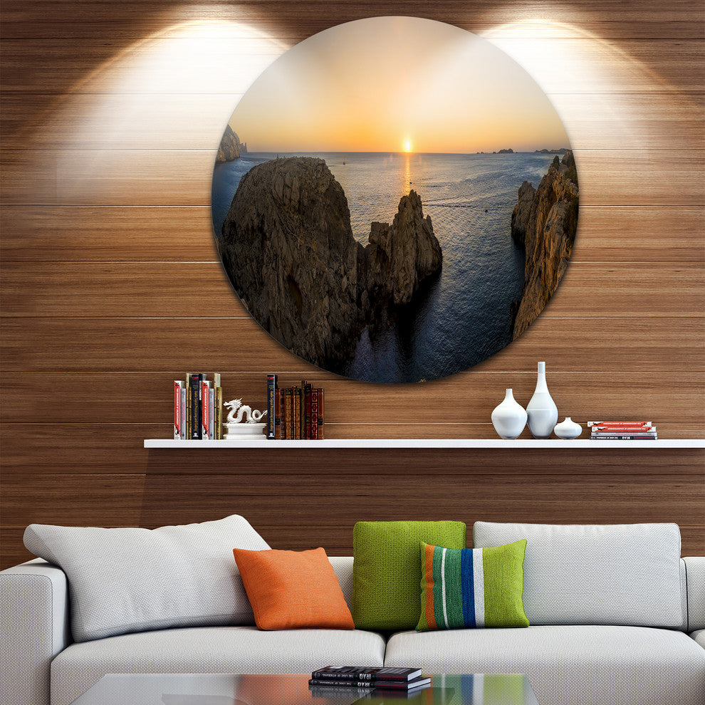 Bring Contemporary Abstraction to your home with this large Circle Metal wall art. This Ibiza Island Mediterranean Sunset Metal Artwork makes it the focal point of any room or office.
