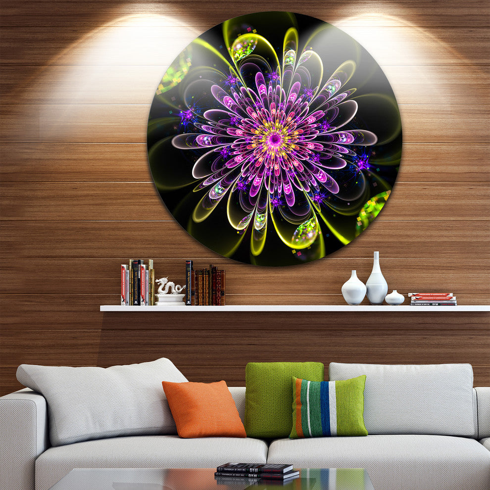 Bring Contemporary Abstraction to your home with this large Circle Metal wall art. This Ideal Digital Art Flower in Purple Yellow Metal Artwork makes it the focal point of any room or office.