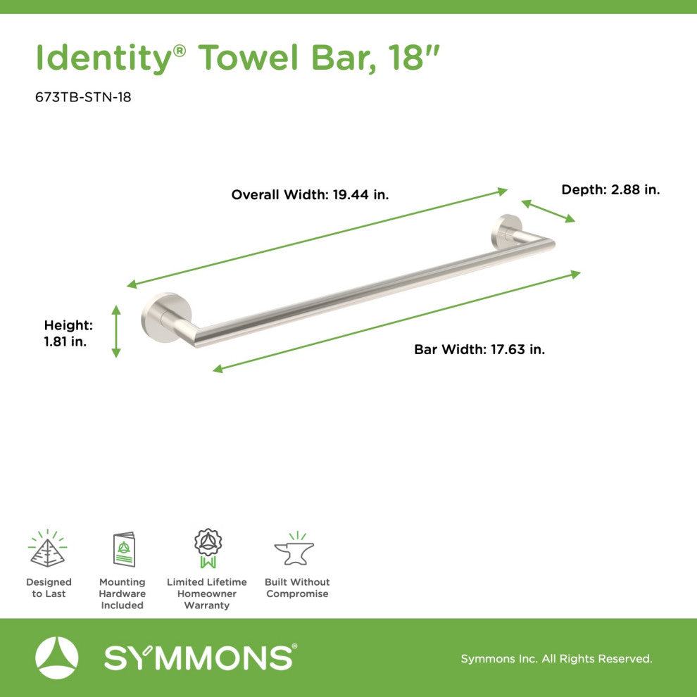 The Symmons Identity Collection balances sleek curves and defined edges with stylish simplicity. This Identity 18 inch Towel Bar is built primarily from brass and stainless steel. It also includes the instructions and hardware required for wall mounting. Easy to install and built to last, this towel holder has a weight capacity of up to 50 pounds. Like all Symmons products, this 18 inch wall mounted bathroom towel bar is backed by a limited lifetime consumer warranty and 10 year commercial warranty.