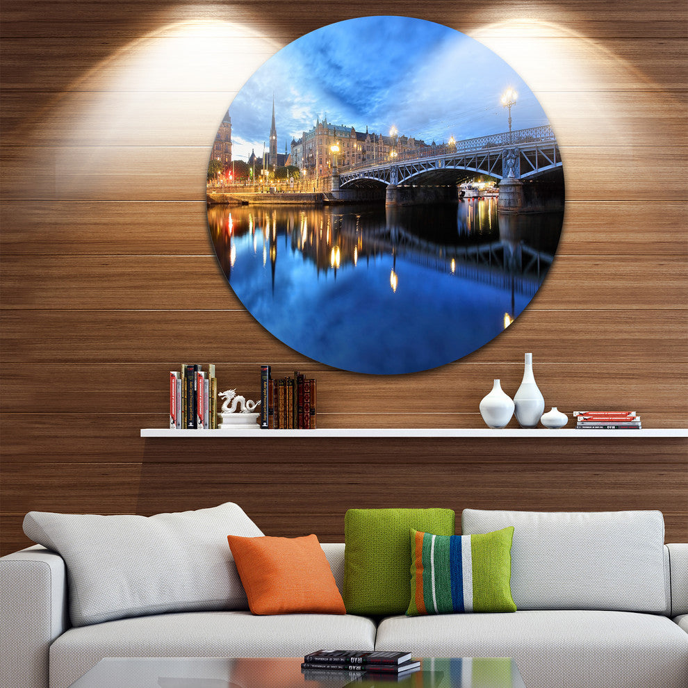 Illuminated Blue Stockholm, Cityscape Disc Metal Artwork, 36"