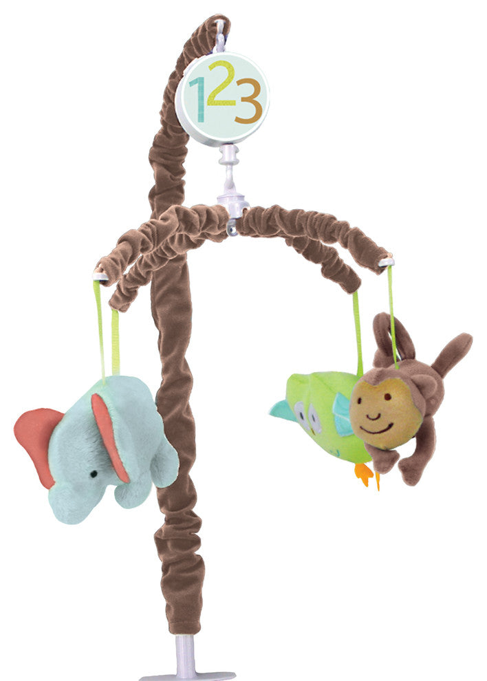 Elephants, Owls and a Monkey circle gently above baby in this playful mobile. Fabric covered armature. Wind up music box plays Brahm"™s Lullaby. Coordinates with Zig Zag and Cosmo Dots nursery bedding collection. 30 in overall height; Mobile pole measures 22 in from top of crib to top of Mobile; Mobile Shade: 14 in x 14 in round.