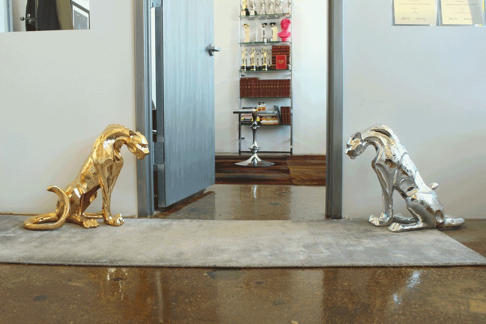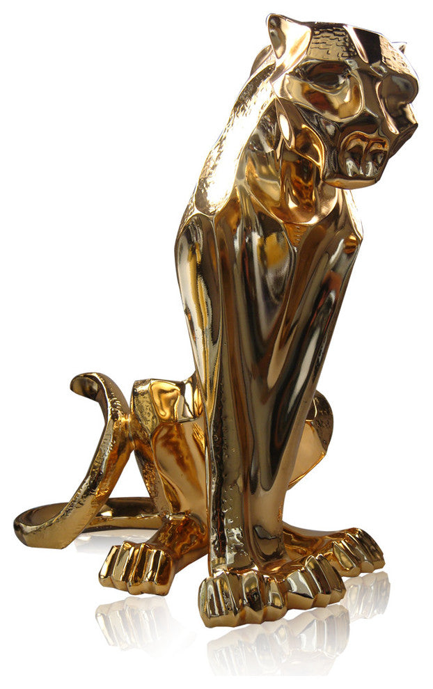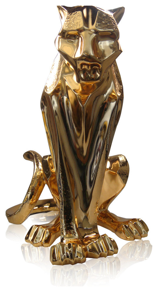 Constructed of hollow fiberglass, this unique scultpure achieves a spectacular presence without being excessively heavy. The flowing design of these cats creates an alluring effect. The mirror finish of these large sculptures is available in copper or silver chrome.