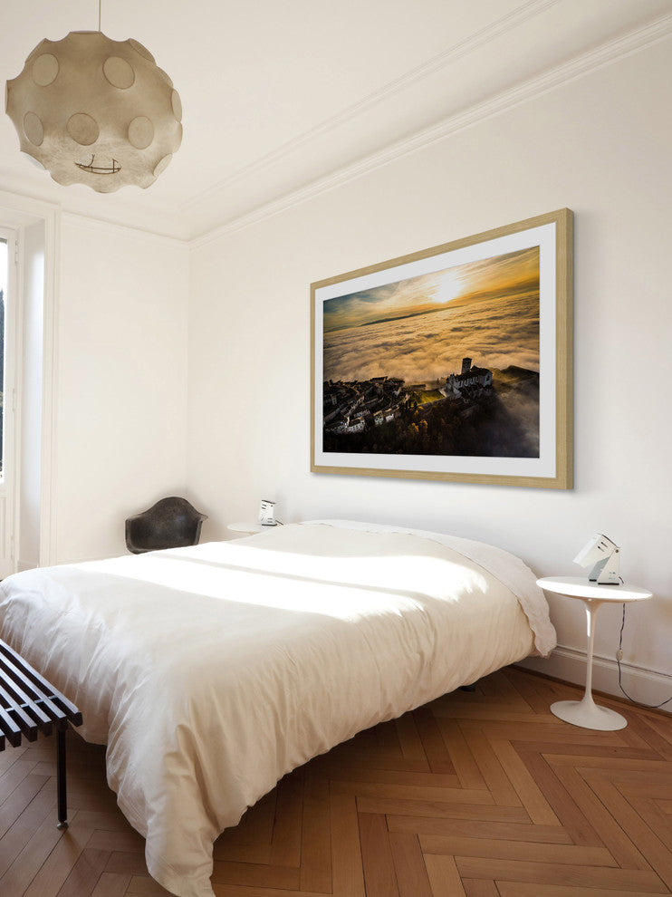 "In the Clouds" Framed Painting Print features vivid tones and supple artistry. Mounted in a gorgeous frame, this 36 inch wide by 24 inch tall piece will be an exceptional addition to any room. Top quality Giclee print on high resolution Archive Paper Artwork by Francesco Cattuto Professionally framed and mounted on acid free archive matte High quality durable non-warping frame Arrives ready to hang Includes a certificate of authenticity Made in the USA
