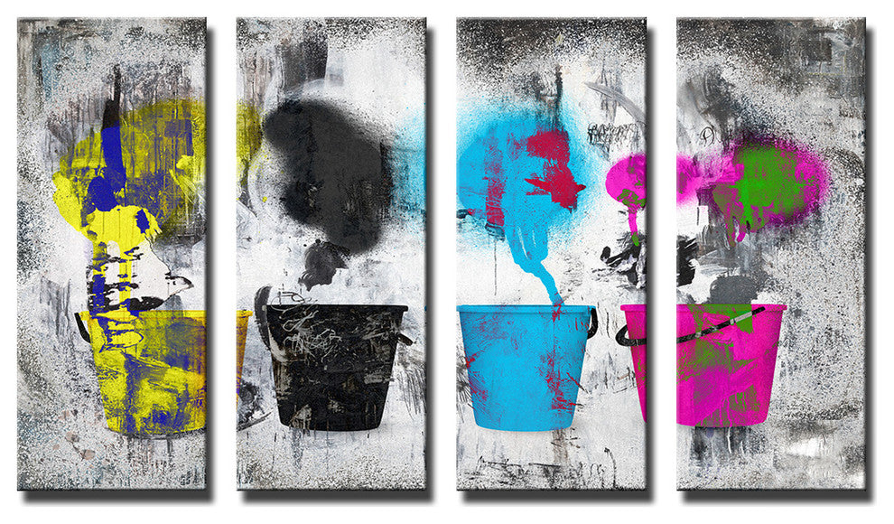 Four colored buckets exude wisps of their own hue in an ambiance of distortion, a mist that afflicts their natural colors into a schism of complexion. This contemporary piece is on canvas and gallery wrapped.