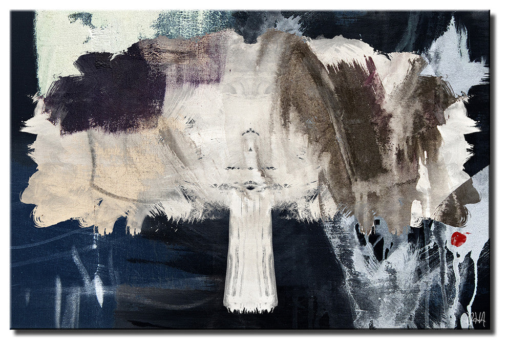 Thick brushstrokes and cursive colors are featured in this horizontal canvas, ''Inkd XXI''. Along running drops of paint, and quite wisps of white, a form is emphasized in the center, dense with the fades and contrasting colors.
