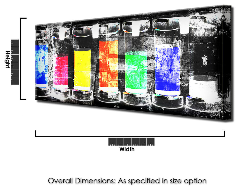 Depicting vats of lustered colors, an image furbished by the glaze of an incorporeal varnish, this extra wide horizontal artpiece is gallery wrapped canvas for a more cohesive look.