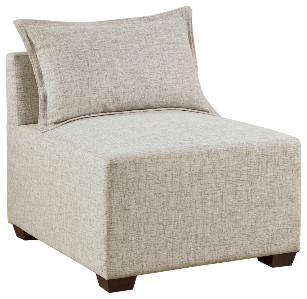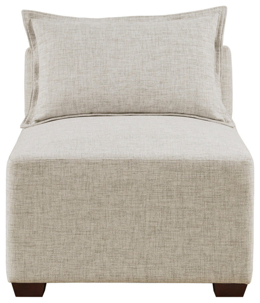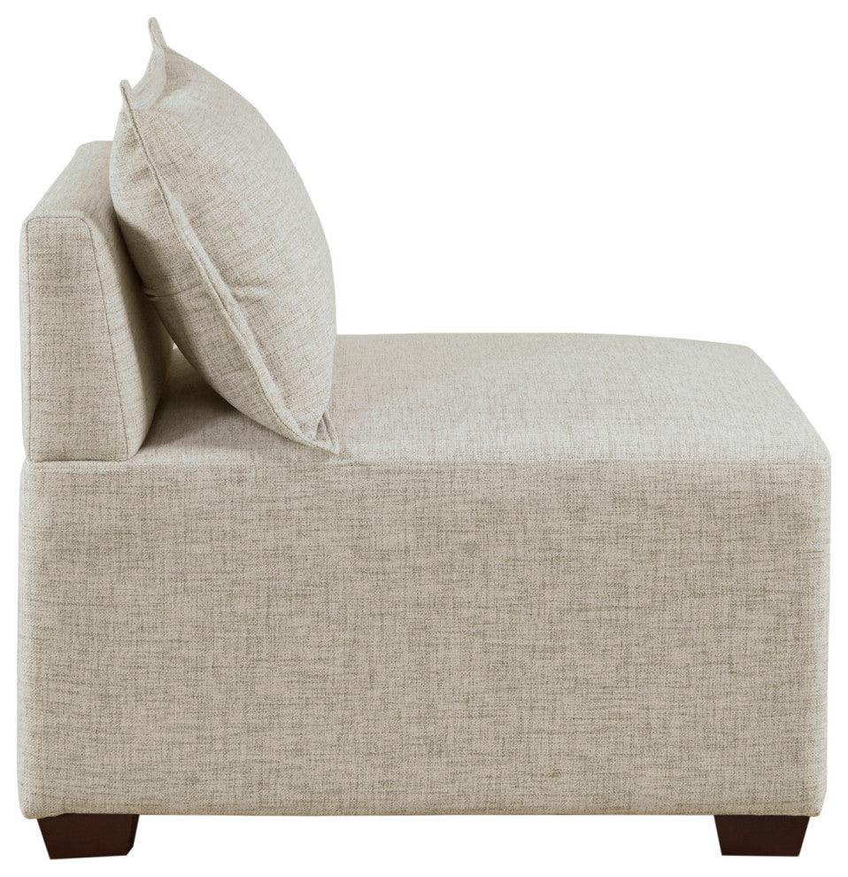 DESCRIPTIONCreate a comfortable seating arrangement in your living room with the modern sectional sofa chairs and ottoman. Upholstered in durable and resilient fabric, the modular pieces feature a sleek and clean design for a casual and long lasting look. With unlimited combinations using pieces from the Molly sofa collection, this modular sectional can be easily tailored to fit in any space and elevate your decor.FEATURES? Modern yet casual modular chair and/or ottoman, providing versatile and customizable configurations based on your space needs? Unlimited configurations possibilities ranging from sofa chaise, L-shaped, U-shaped, and standard sofa shapes, or simply be used as a standalone furniture piece? Low back chairs removable flange seamed pillow included on each chair (ottoman not includes pillow)? Upholstered in performance fabric to enhance durability ? Solid wood block feet in dark espresso finish? Assembly required, tools included? Weight capacity: 300 lbsMATERIALSFrame/Arm: Solid wood and plywoodLeg: Solid wood Fabric: 100% polyester, wovenFilling: FoamWood Finish: Dark espressoSIZE DESCRIPTION2 Corner Chairs:34"W x 34"D x 28"H (2)3 Armless Chairs:30"W x 34"D x 28"H (3)