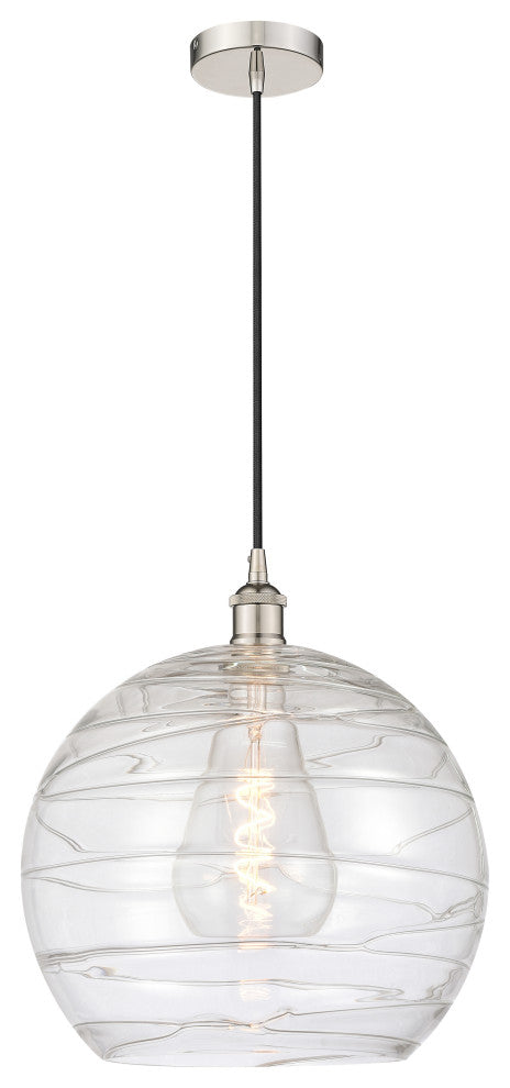 Innovations 616-1P-PN-G1213-14 1-Light Pendant Polished Nickel. Collection: Edison. Style: Industrial, Modern Contempo, Restoration-Vintage, Transitional. Metal Finish: Polished Nickel. Metal Finish (Canopy/Backplate): Polished Nickel. Material: Steel, Cast Brass, Glass. Dimension(in): 16. 875(H) x 13. 75(W) x 13. 75(Dia). Min/Max Height (Fixture Height with Cord or Included Stems and Canopy)(in): 19. 875/136. 875. Wire/Cord: 10 Feet Of Black Fabric Cord. Bulb: (1)60W Medium Base,Dimmable(Not Included). Maximum Wattage Per Socket: 100. Voltage: 120. Color Temperature (Kelvin): 2200. CRI: 99. 9. Lumens: 220. Glass Shade Description: Clear Athens Deco Swirl 8". Glass or Metal Shade Color: Clear Deco Swirl. Shade Material: Glass. Glass Type: Transparent. Shade Shape: Globe. Shade Dimension(in): 13(W) x 12. 125(H). Fitter Measurement (Glass Or Metal Shade Fitter Size): Neckless with a 2. 125 inch Hole. Canopy Dimension(in): 4. 75(Dia) x 1(H). Sloped Ceiling Compatible: Yes. California Proposition 65 Warning Required: Yes. UL and ETL Certification: Damp Location.