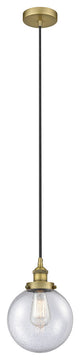 Innovations 616-1PH-BB-G204-8 1-Light Mini Pendant Brushed Brass. Collection: Edison. Style: Industrial, Restoration-Vintage, Traditional. Metal Finish: Brushed Brass. Metal Finish (Canopy/Backplate): Brushed Brass. Material: Steel, Cast Brass, Glass. Dimension(in): 11. 5(H) x 8(W) x 8(Dia). Min/Max Height (Fixture Height with Cord or Included Stems and Canopy)(in): 15/133. Wire/Cord: 10 Feet Of Black Fabric Cord. Bulb: (1)60W Medium Base,Dimmable(Not Included). Maximum Wattage Per Socket: 100. Voltage: 120. Color Temperature (Kelvin): 2200. CRI: 99. 9. Lumens: 220. Glass Shade Description: Seedy Beacon. Glass or Metal Shade Color: Seedy. Shade Material: Glass. Glass Type: Seeded. Shade Shape: Sphere. Shade Dimension(in): 8(W) x 7. 75(H). Fitter Measurement (Glass Or Metal Shade Fitter Size): 3. 25 inch Fitter. Canopy Dimension(in): 4. 75(Dia) x 1(H). Sloped Ceiling Compatible: Yes. California Proposition 65 Warning Required: Yes. UL and ETL Certification: Damp Location.