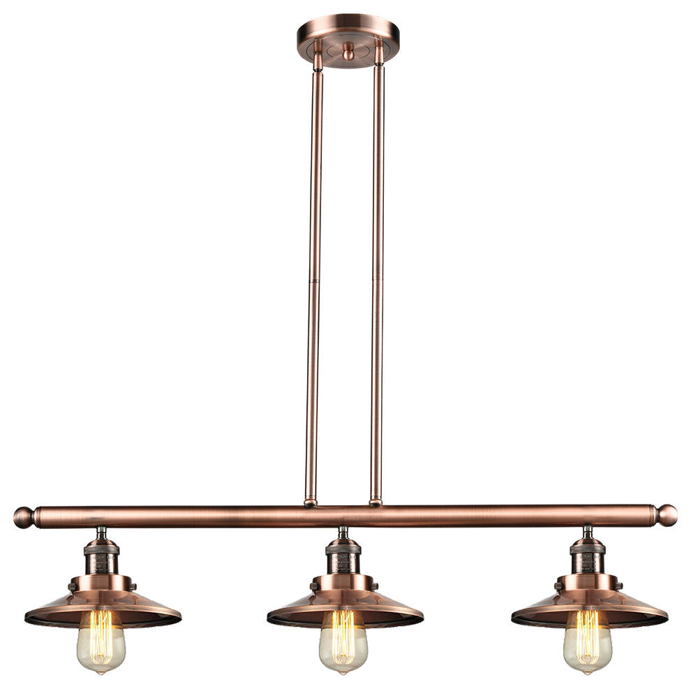 INNOVATIONS LIGHTING 213-AC-M3 Railroad 3 Light Island Light part of the Franklin Restoration Collection. The Railroad 3 Light Island Light is part of the Franklin Restoration Collection.Includes 2-6 and 4-12 inch Stems.Additional Stems sold separately.Solid Brass 180 Degree Adjustable Swivels with internal teeth that lock in at 5 degree intervals With Engraved Cast Cup.Solid Brass 90 Degree Hang Straight Swivel for Sloped Ceilings Included. Collection: Franklin Restoration. Material: Steel, Cast Brass. Metal Finish(Body): Antique Copper. Metal Finish(Shade): Antique Copper. Metal Finish(Canopy/Backplate): Antique Copper. Dimension(in): 40.5(W) x 10(H) x 6(Ext). Minimum Height (Fixture Height with Shade, Cord or Included Stems & Canopy)(in): 16.25. Max Height (Fixture Height with Cord or Included Stems & Canopy)(in): 40.25. Wire/Cord: 10 Feet Of Wire. Bulb: (3)100 Medium Base Vintage Bulb recommended(Not Included). Voltage: 120. Shade Shape: Cone. Shade Color: Antique Copper. Shade Material: Metal. Shade Size(in): 8 X 2. Shade Fitter Measurement: 3.25 inch Fitter. Canopy Dimension(in): 4.5 x 0.75.. Solid Brass 180 Degree Adjustable Swivels with internal teeth that lock in at 5 degree intervals With Engraved Cast Cup. Solid Brass 90 Degree Hang Straight Swivel for Sloped Ceilings Included. UL/CUL Damp Rated. Warranty: 2 Year Finish, Lifetime Electrical.