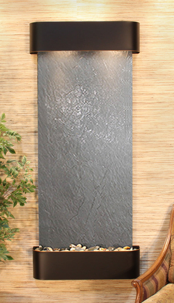 The Inspiration Falls Water Fountain by Adagio Water Features brings peace and tranquility to your home. This vertical wall water fountain adds the majesty of a waterfall along with the beauty and calming effects of running water to your living room, den, family room, front entryway, or any other room in your home. Imagine coming in from a long day at work or play and being able to sit and relax as you listen to your own personal water feature. With the many metal trim and water surface options available, you are sure to find just the right one for your space.30" L x 69" H x 6" D, easy to hang, complete with colored instructions and hardware for hanging on a sheetrock wall. Hanging Weight 100 lbs. This unit includes: 3 halogen light Polished river rocks Electric pump 3-way pull chain that allows you to run just lights, just water, or lights and water. Welded plastic liner insures against leaking and unique water distribution unit system will not clog. 110V, 100W; one cord operates entire unit; 90 degree plug can be concealed behind water feature. Durable powder coat finish; Manufactured and assembled in the USA with a 1 year limited warranty. • This light-weight slate veneer known as FeatherStone is natural stone and therefore may differ in color and texture from the photos shown.