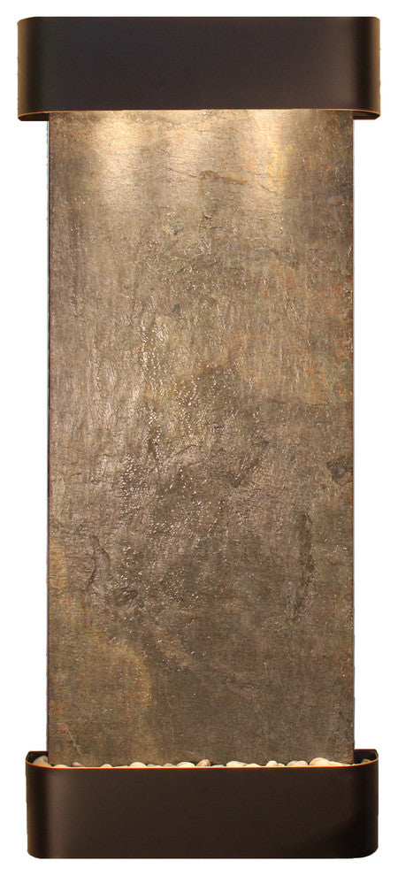 The Inspiration Falls Water Fountain by Adagio Water Features brings peace and tranquility to your home. This vertical wall water fountain adds the majesty of a waterfall along with the beauty and calming effects of running water to your living room, den, family room, front entryway, or any other room in your home. Imagine coming in from a long day at work or play and being able to sit and relax as you listen to your own personal water feature. With the many metal trim and water surface options available, you are sure to find just the right one for your space.30" L x 69" H x 6" D, easy to hang, complete with colored instructions and hardware for hanging on a sheetrock wall. Hanging Weight 100 lbs. This unit includes: 3 halogen light Polished river rocks Electric pump 3-way pull chain that allows you to run just lights, just water, or lights and water. Welded plastic liner insures against leaking and unique water distribution unit system will not clog. 110V, 100W; one cord operates entire unit; 90 degree plug can be concealed behind water feature. Durable powder coat finish; Manufactured and assembled in the USA with a 1 year limited warranty. • This light-weight slate veneer known as FeatherStone is natural stone and therefore may differ in color and texture from the photos shown.