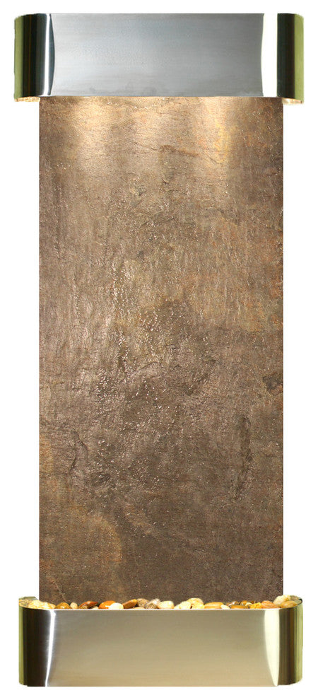 The Inspiration Falls Water Fountain by Adagio Water Features brings peace and tranquility to your home. This vertical wall water fountain adds the majesty of a waterfall along with the beauty and calming effects of running water to your living room, den, family room, front entryway, or any other room in your home. Imagine coming in from a long day at work or play and being able to sit and relax as you listen to your own personal water feature. With the many metal trim and water surface options available, you are sure to find just the right one for your space.30" L x 69" H x 6" D, easy to hang, complete with colored instructions and hardware for hanging on a sheetrock wall. Hanging Weight 100 lbs. This unit includes: 3 halogen light Polished river rocks Electric pump 3-way pull chain that allows you to run just lights, just water, or lights and water. Welded plastic liner insures against leaking and unique water distribution unit system will not clog. 110V, 100W; one cord operates entire unit; 90 degree plug can be concealed behind water feature. Durable powder coat finish; Manufactured and assembled in the USA with a 1 year limited warranty. • This light-weight slate veneer known as FeatherStone is natural stone and therefore may differ in color and texture from the photos shown.