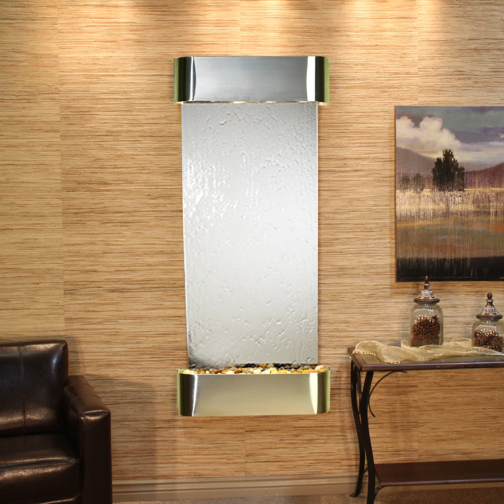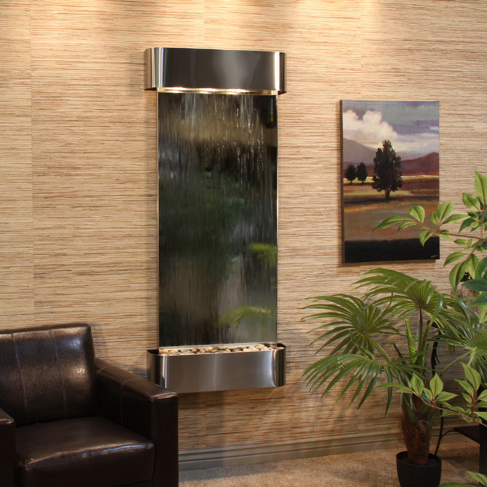 The Inspiration Falls Water Fountain by Adagio Water Features brings peace and tranquility to your home. This vertical wall water fountain adds the majesty of a waterfall along with the beauty and calming effects of running water to your living room, den, family room, front entryway, or any other room in your home. Imagine coming in from a long day at work or play and being able to sit and relax as you listen to your own personal water feature. With the many metal trim and water surface options available, you are sure to find just the right one for your space.30" L x 69" H x 6" D, easy to hang, complete with colored instructions and hardware for hanging on a sheetrock wall. Hanging Weight 130 lbs. This unit includes: 3 halogen light Polished river rocks Electric pump 3-way pull chain that allows you to run just lights, just water, or lights and water. Welded plastic liner insures against leaking and unique water distribution unit system will not clog. 110V, 100W; one cord operates entire unit; 90 degree plug can be concealed behind water feature. Durable powder coat finish; Manufactured and assembled in the USA with a 1 year limited warranty.