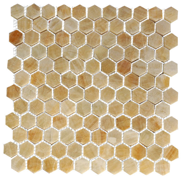 Yellow Onyx Hexagon on 12"x12" sheets on a Mesh backing for easy installation. This dynamic yellow, brown and cream tiles are exquisite and unique and ideal for walls applications including kitchen backsplashes and bathroom surrounds.Residential UsageF