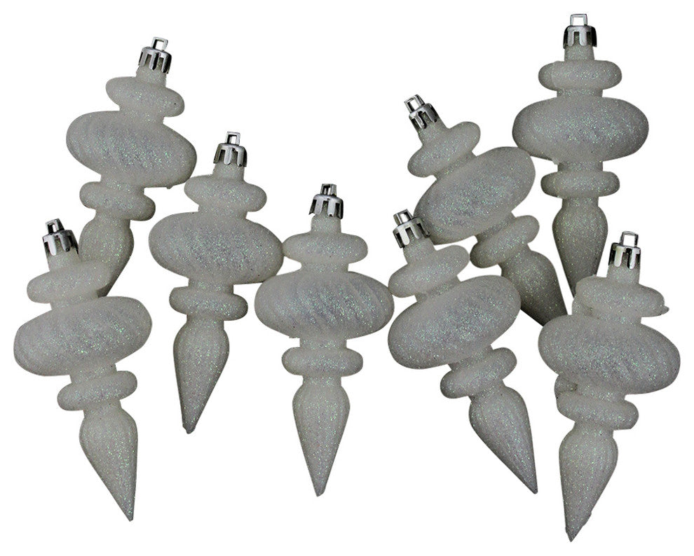 8-piece set | Color: winter white | Finish: glitter | These cute finial ornaments have a swirl design and are done with an iridescent glitter finish | Shatterproof ornaments combine the beauty and luster of real glass with the unbreakable practicality of plastic | Ornaments are equipped with silver ornament caps | Dimensions: 4.25"H x 2" diameter | Material(s): plastic