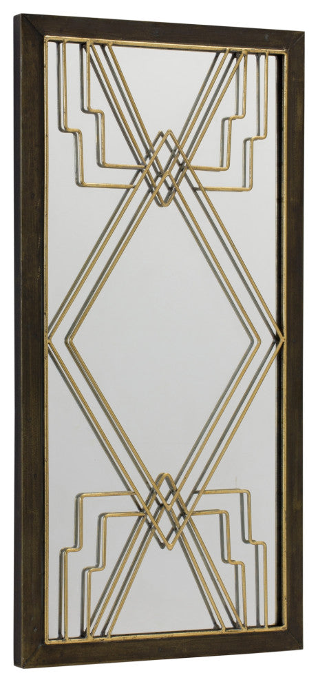 Beautify your living space with this beautiful Iron Art Deco Mirror. Featuring a chic gold geometric design with classic black frame, this elegant piece would make a great addition to the boho, art deco, or chic-antique style of home Decor. The quality glass mirror and iron metal frame is sure to endure for years to come. Display the piece on your wall to add interest, or lean it against the wall alongside other decor.