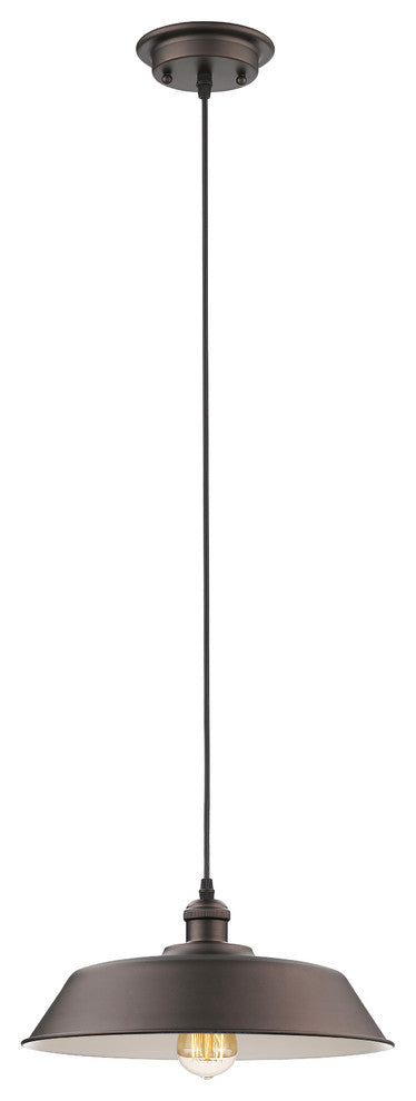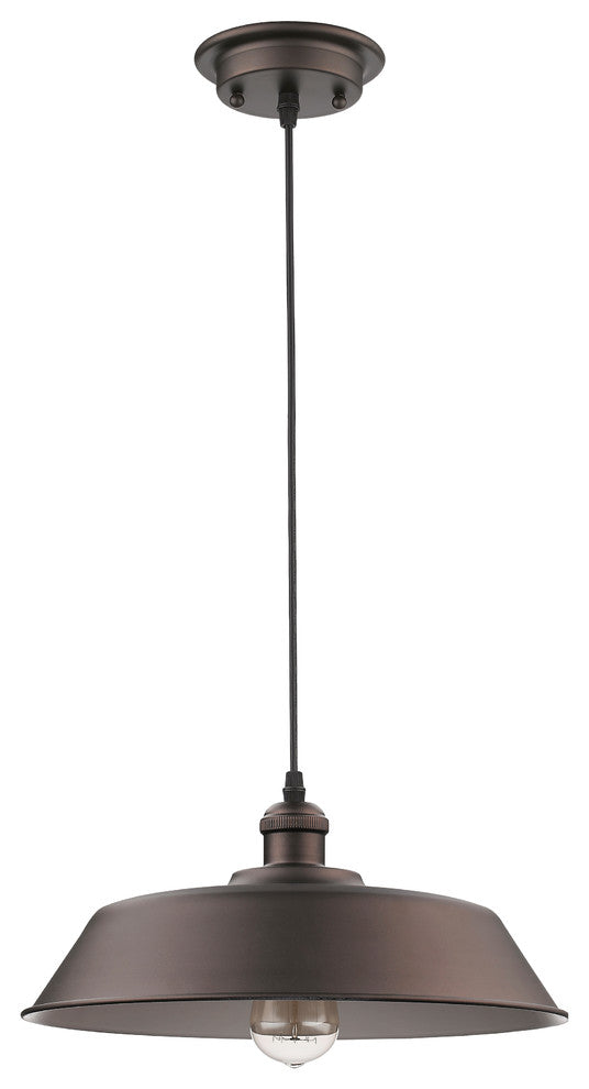 This 1-light pendant features an oil rubbed bronze finish that will complement many industrial and transitional decors. The clean lines of the steel frame and matching metal shade softens the light to create a warm ambiance for any space.