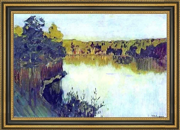 16" x 24" Isaac Ilich Levitan Sunset over a Forest Lake. Study framed premium canvas print reproduced to meet museum quality standards. Our Museum quality canvas prints are produced using high-precision print technology for a more accurate reproduction printed on high quality canvas with fade-resistant, archival inks. Our progressive business model allows us to offer works of art to you at the best wholesale pricing, significantly less than art gallery prices, affordable to all. This artwork is hand stretched onto wooden stretcher bars, then mounted into our 3 3/4" wide gold finish frame with black panel by one of our expert framers. Our framed canvas print comes with hardware, ready to hang on your wall. We present a comprehensive collection of exceptional canvas art reproductions by Isaac Ilich Levitan.