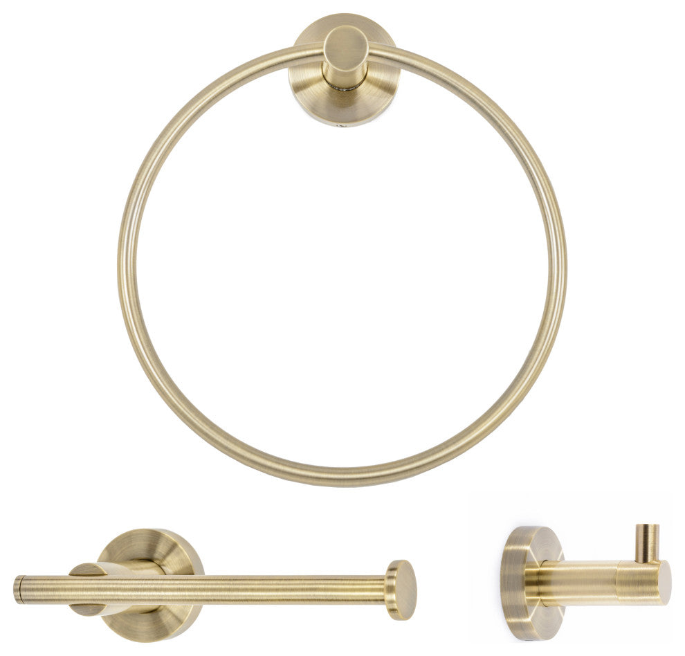 Enjoy a bathroom update with ease, all while saving money with the help of our new Venezia Series bathroom accessory set. This 3-piece set includes a towel ring, toilet paper holder and single robe hook from one of Italia�s most popular series. All three accessories feature a beautiful bronze finish and our easy install mounting system. You won�t be disappointed with this sleek European inspired set of bathroom accessories. Additional pieces may be purchased individually.
