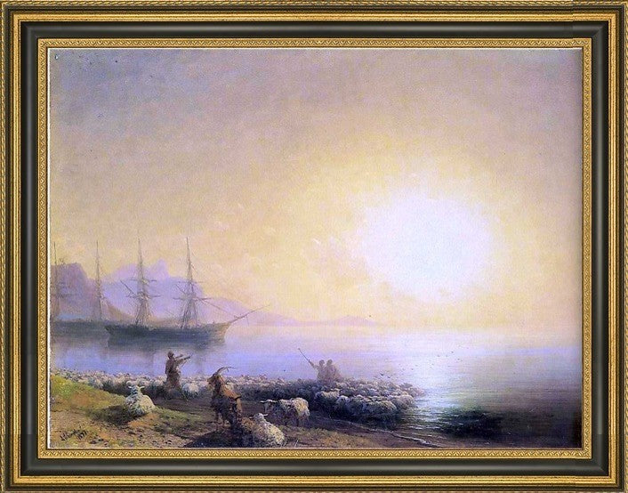 18" x 24" Ivan Constantinovich Aivazovsky Bathing of a sheeps framed premium canvas print reproduced to meet museum quality standards. Our Museum quality canvas prints are produced using high-precision print technology for a more accurate reproduction printed on high quality canvas with fade-resistant, archival inks. Our progressive business model allows us to offer works of art to you at the best wholesale pricing, significantly less than art gallery prices, affordable to all. This artwork is hand stretched onto wooden stretcher bars, then mounted into our 3 3/4" wide gold finish frame with black panel by one of our expert framers. Our framed canvas print comes with hardware, ready to hang on your wall. We present a comprehensive collection of exceptional canvas art reproductions by Ivan Constantinovich Aivazovsky .