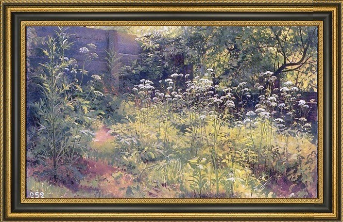 18" x 27" Ivan Ivanovich Shishkin Aegopodium, Pargolovo (etude) framed premium canvas print reproduced to meet museum quality standards. Our Museum quality canvas prints are produced using high-precision print technology for a more accurate reproduction printed on high quality canvas with fade-resistant, archival inks. Our progressive business model allows us to offer works of art to you at the best wholesale pricing, significantly less than art gallery prices, affordable to all. This artwork is hand stretched onto wooden stretcher bars, then mounted into our 3 3/4" wide gold finish frame with black panel by one of our expert framers. Our framed canvas print comes with hardware, ready to hang on your wall. We present a comprehensive collection of exceptional canvas art reproductions by Ivan Ivanovich Shishkin.