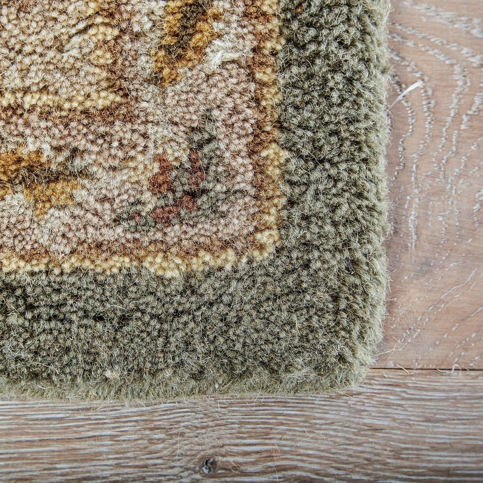 This hand-tufted area rug offers vintage elegance to traditional homes. Scrolling vines and floral medallions gracefully cover this classic wool layer in sage green, warm beige, and rusted red-brown.