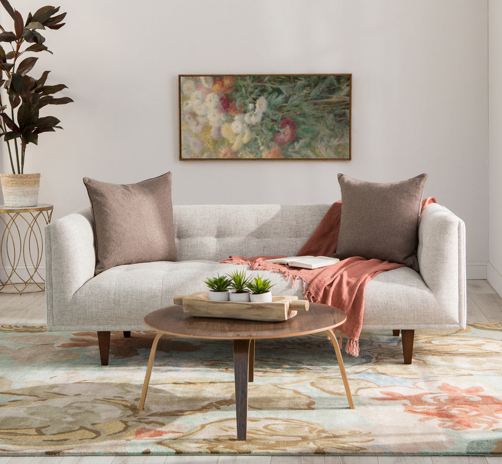 This hand-tufted area rug delivers artistic charm with soft yet playful hues. Watercolor blooms in tan, blue, and red create a large-scale design on the pale green backdrop, while the wool and viscose blend offers a sumptuous feel underfoot.