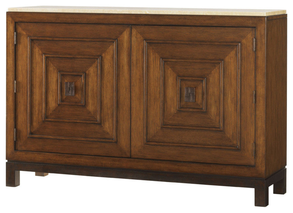 The custom designed door pull embodies the recessive framing of the door fronts and draws attention for the forefront yet opens to reveal four adjustable shelves, ideal in any room. The honed travertine top is casually elegant and stylish.