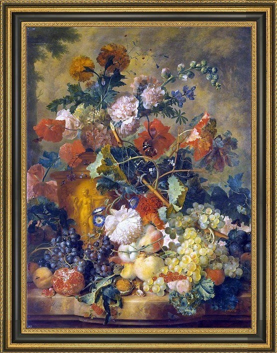 18" x 24" Jan Van Huysum Flowers and Fruit framed premium canvas print reproduced to meet museum quality standards. Our Museum quality canvas prints are produced using high-precision print technology for a more accurate reproduction printed on high quality canvas with fade-resistant, archival inks. Our progressive business model allows us to offer works of art to you at the best wholesale pricing, significantly less than art gallery prices, affordable to all. This artwork is hand stretched onto wooden stretcher bars, then mounted into our 3 3/4" wide gold finish frame with black panel by one of our expert framers. Our framed canvas print comes with hardware, ready to hang on your wall. We present a comprehensive collection of exceptional canvas art reproductions by Jan Van Huysum .