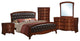 Dark Cherry Finish; Luxurious Faux Woodgrain Detail; Antique Brushed Nail Head Accents; Elegant Scrolled Headboard; Two Tone Faux Leather Headboard; Spacious Storage Footboard; Intricate Molding Accents Throughout; Elegant Marble Topped Nightstand