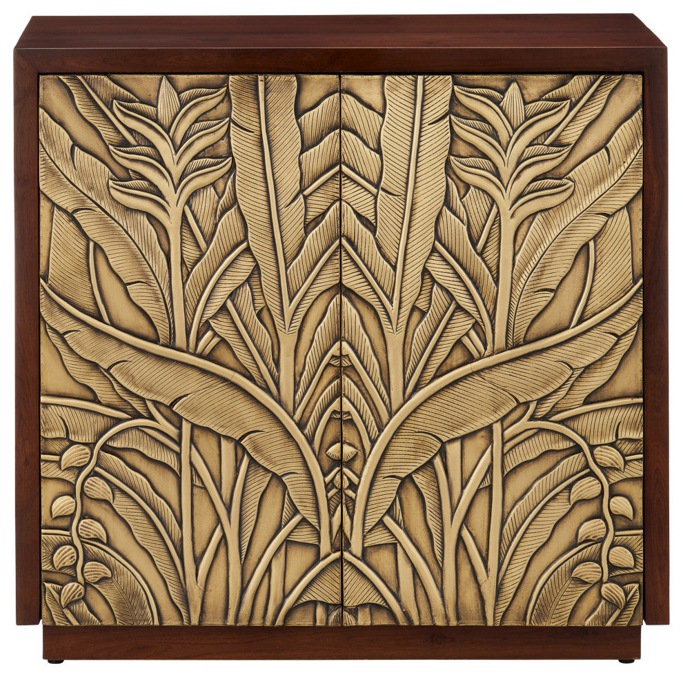 The Jardin Cabinet was created in the tradition of repoussage "” a painstaking and laborious process that involves creating low-relief panels with raised motifs onto which thin brass sheets are hammered to reveal the visual richness underneath. In this case, the doors and frame are made of reclaimed teak, finished in walm walnut. The metalwork is rendered in an antique brass finish. This is a tall cabinet, standing 38.5 inches high.