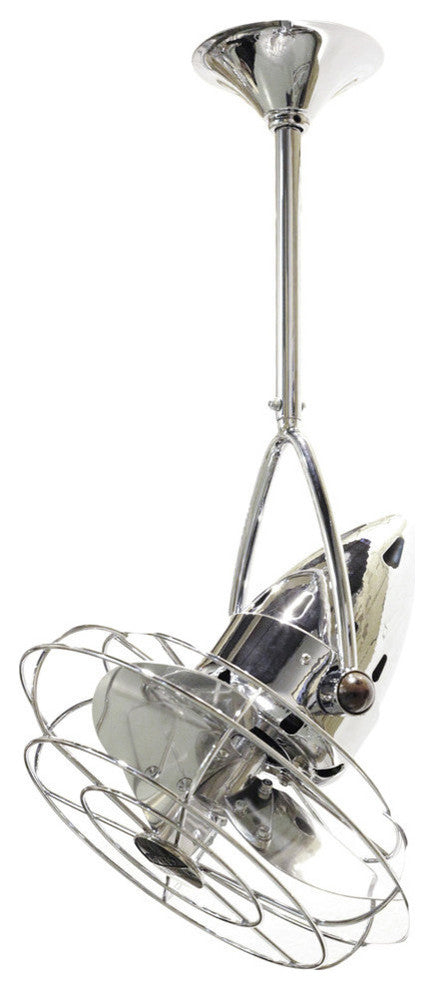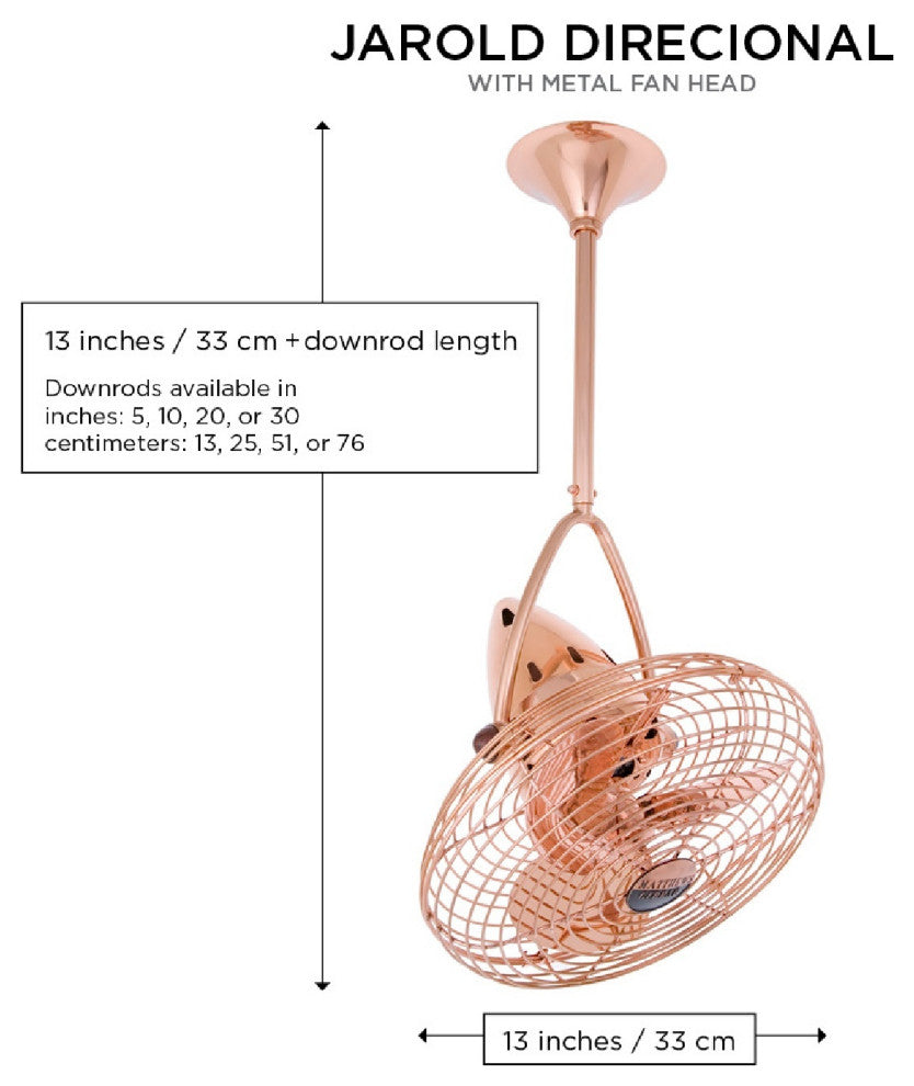 Unique and versatile, the fan head of the Jarold Direcional ceiling fan can be infinitely positioned in a 180-degree arc, forward and reverse, to provide maximum, directional airflow. The Jarold can be hung in small, awkward spaces or in front of HVAC ducts to make more efficient the heating, ventilation or air conditioning of any space.Features: All Matthews Gerbar fans are hand made and not mass produced.Constructed of cast aluminum, heavy spun and stamped steel, this fan carries a limited lifetime warranty.Each Unique Motor Mount and Fan Head Knob is Made of Genuine Marbleized BakeliteFan Head is Infinitely Adjustable 180 Degrees in Forward and Reverse PositionsDistance Between Top of Yolk and Bottom of Blades is as Follows: 15" for Metal Blades; 16" for Wood BladesLutron Decora-Style SFS-5E Fully Variable Wall Switch in White IncludedFlat Ceiling CanopyIncludes 10" field cuttable downrod. Downrods can be easily field cut; they are not threaded. Can be installed with a maximum 30" downrod.Made in Brazil. Assembled and tested with care in the USA.Matthews-Gerbar fans do not oscillate on their own. The fan heads can be pivoted to change the direction.