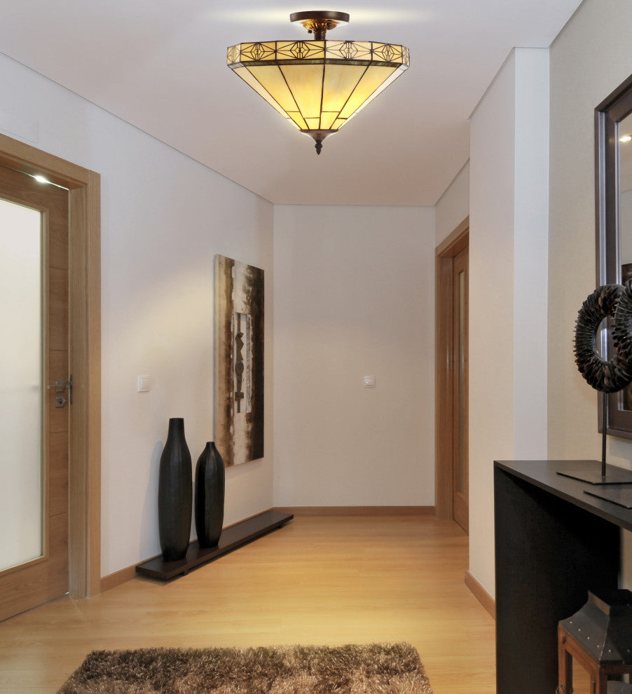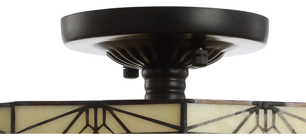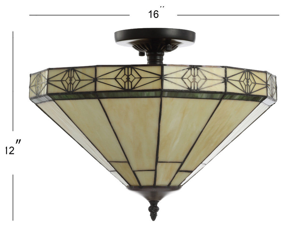 Opulent and elegant, the glasswork of this milked glass semi-flush mount is reminiscent of Tiffany antiques, but without the price point. With a mosaic glass shade and metal fretwork around the rim, it''s a great way to infuse a lot of style in a room with a lower ceiling. At 12" wide, it''s well portioned for powder rooms or overhead lighting in living spaces. Features:• Constructed from artisanal glass and pieced together by hand, this fixture is a work of art • As this fixture must be hardwired, we recommend a professional electrician manage installation• Eco-friendly 9W LED bulb included• Takes two bulbs and compatible with any 9W LED or 40W TYPE "A" or 13W CFL• UL Listed • Color: Cream• Body Material: Glass/Metal• Includes: One (1) lamp(s)• Assembly RequiredDimensions:• Lamp: 12 inches high x 16 inches wide x 16 inches deepAbout us:You see a lamp.We see a decorative work of art.A perfectly curved shade casts a dramatic shadow on a floor. A silk cord you never want to hide. LED lightbulbs: as easy on the environment as they are on the eyes. The JONATHAN Y Lighting collection considers every detail from impeccably sourced materials to designer styling. And our prices are so attractive, we''ve transformed a functional necessity into a fashion accessory.JONATHAN Y Lighting - a fashion revolution in home decor.