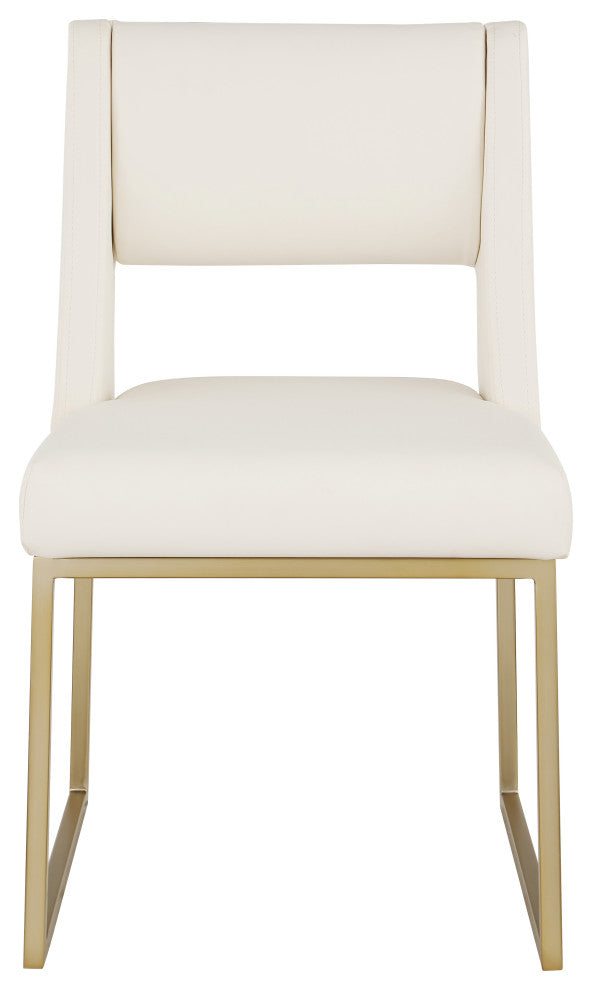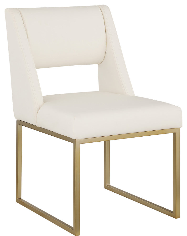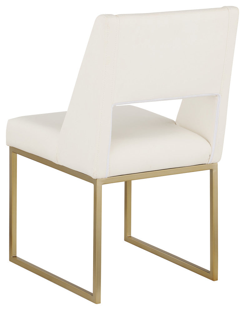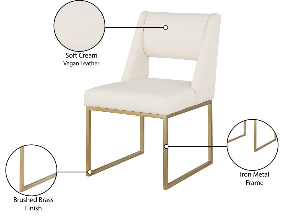 Get comfy at your dinner table with this Jayce cream vegan leather dining chair. Its soft cream vegan leather upholstery offers a comfortable place to sit, while its brushed brass iron base provides stability and durability. Its semi-open back, contemporary design is ideal for any modern home decor, while also providing you with upper back support while you enjoy your meal. A foam cushion ensures additional comfort while you sit, so you can enjoy meals on a whole new level.Overall Product Dimensions: 19" W x 22.5" D x 33" HSoft Cream Vegan LeatherBrushed Brass FinishIron Metal FrameContemporary DesignSeat Dimensions: Seat Width: 20.0787"Seat Height: 18.11"Seat Depth: 22.44"Back Height: 14.56"