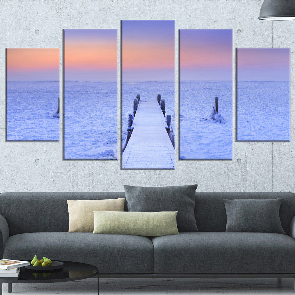 "Jetty in Frozen Lake Netherlands" Wooden Sea Bridge Wall Art, 5 Panels, 60"x32"