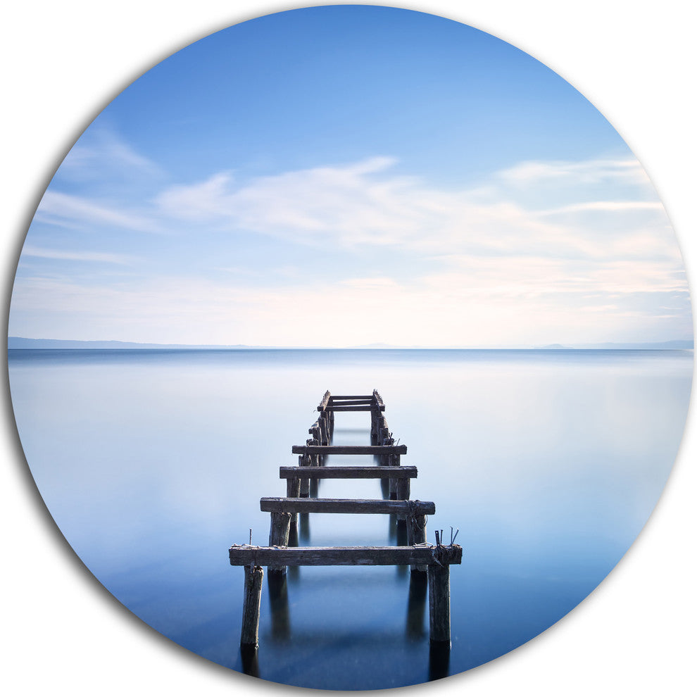 Jetty Remains In Blue Lake, Seascape Photo Round Metal Wall Art, 36"